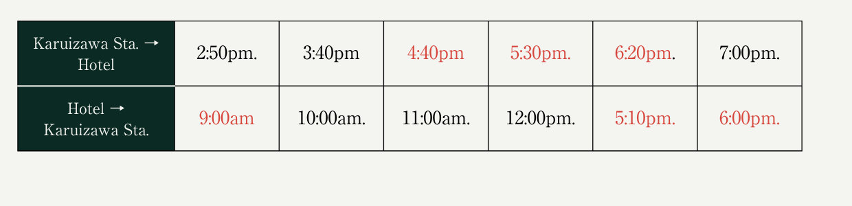 Depart from the Karuizawa Station outlet side (South Exit) near the taxi stand at the bottom of the stairs. Hotel staff will be waiting for you at the above times.