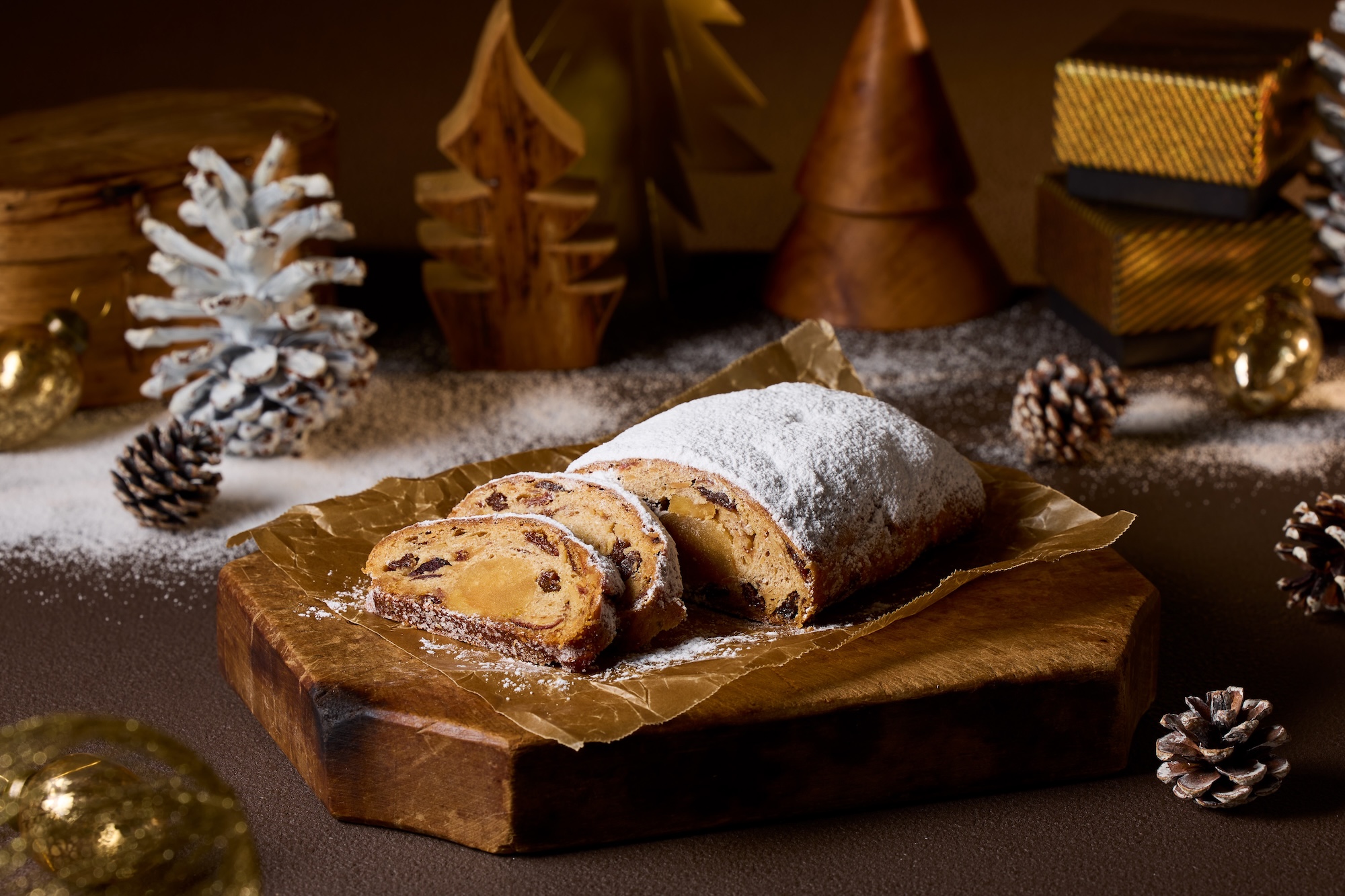 たっぷりのバターを練り込んだ生地にドライフルーツやナッツを練り込み、中央にマジパンを入れた伝統的な製法で焼き上げました。従来のどっしりしたシュトーレンではなく、しっとりとしながらも軽い口当たりで飽きずにお召し上がりいただけます。