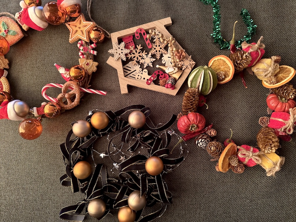 ベースとなる形を選んで素材を巻いたり貼り付けて作るクリスマスリース。