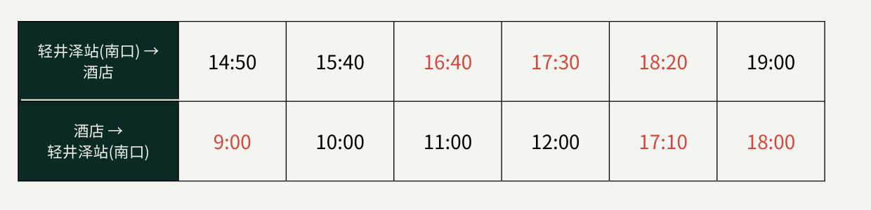 从轻井泽站畅货中心旁(南口),楼梯底近的士站出发。酒店职员会于上述时间于该处等侯。无需预约。