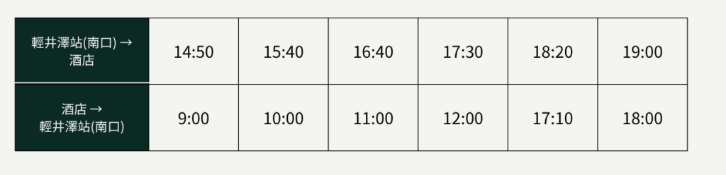 2026年4月25日至5月5日期間,將新增一班於20:00自輕井澤站前往酒店的接駁車。